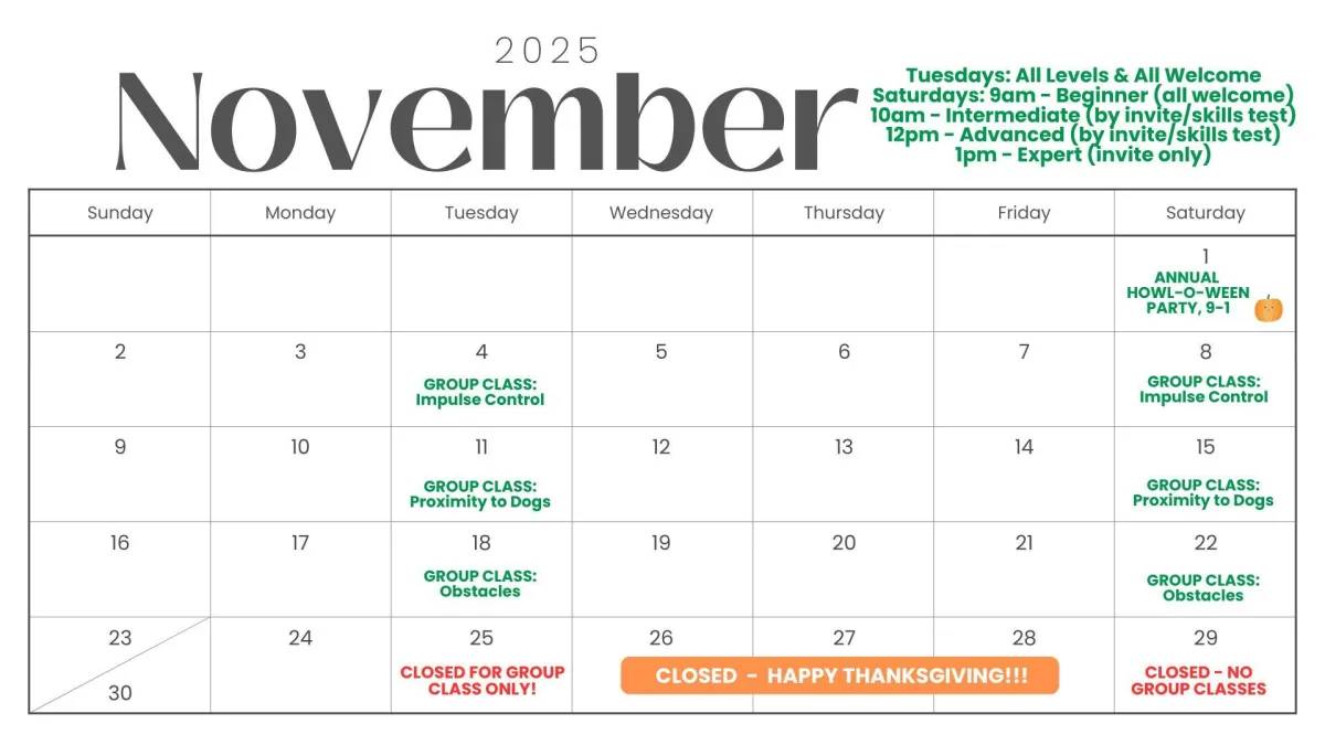 CLOSED FOR REGULAR DREAM DOG TRAINING: Wednesday, Nov. 26th - Friday, Nov. 28th